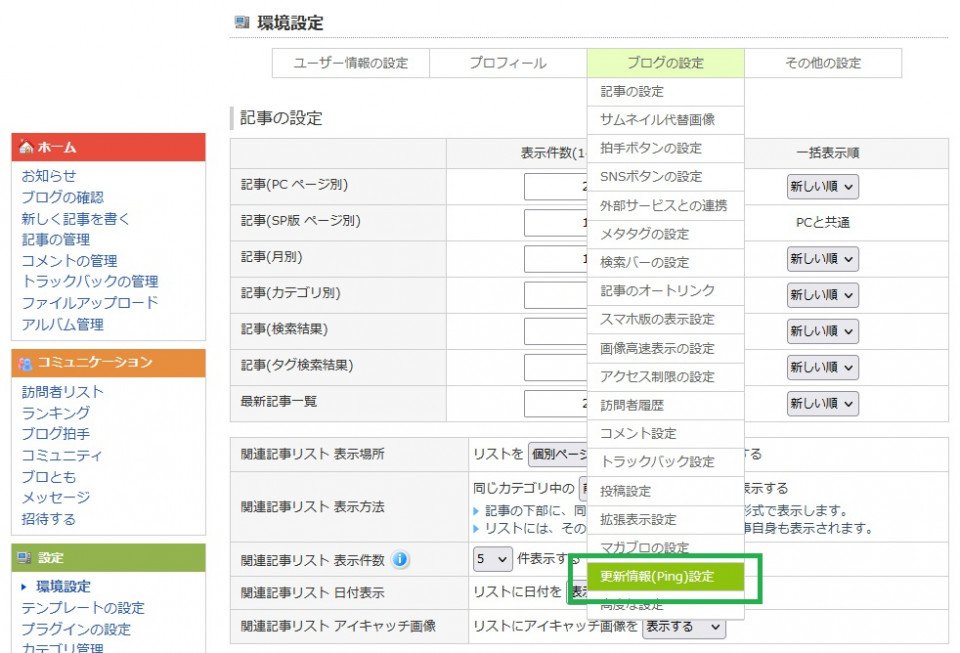 「環境設定」>「ブログの設定」>「更新情報(Ping)設定」について説明を行います。