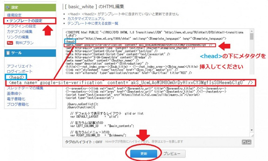 テンプレートのHTML編集画面内にある<head>の下に、コピーしたメタタグを貼り付けます。
