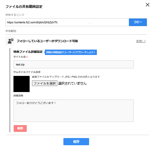 ご選択いただくと、特典ファイルの詳細をご設定いただけます。