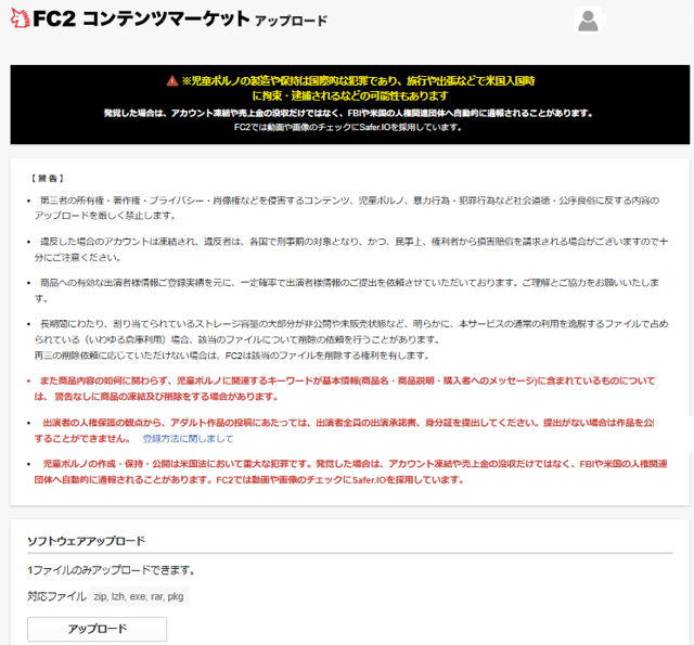3.[ アップロード]ボタンをクリックし、FC2コンテンツマーケットサーバーへ