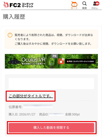 商品タイトルまたは、「購入した動画を視聴する」をクリックし、商品の内容を確認します。