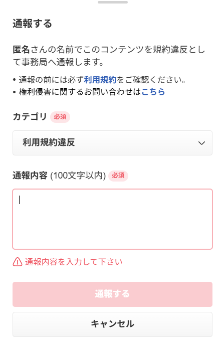 カテゴリを選択後、通報内容を100文以内で入力し「通報する」をタップしてください。
