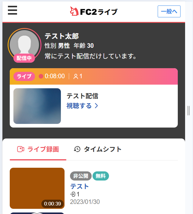 配信者のプロフィールや「ライブ録画」「タイムシフト」等の