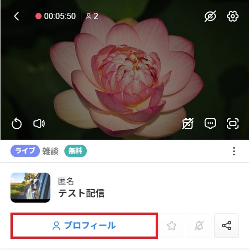 配信を視聴中にプレイヤーをタップすると、「プロフィール」ボタンが表示されます。