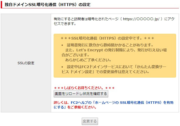 ※全ての設定が完了するまで「SSL暗号化通信(HTTPS)設定中」状態になります。