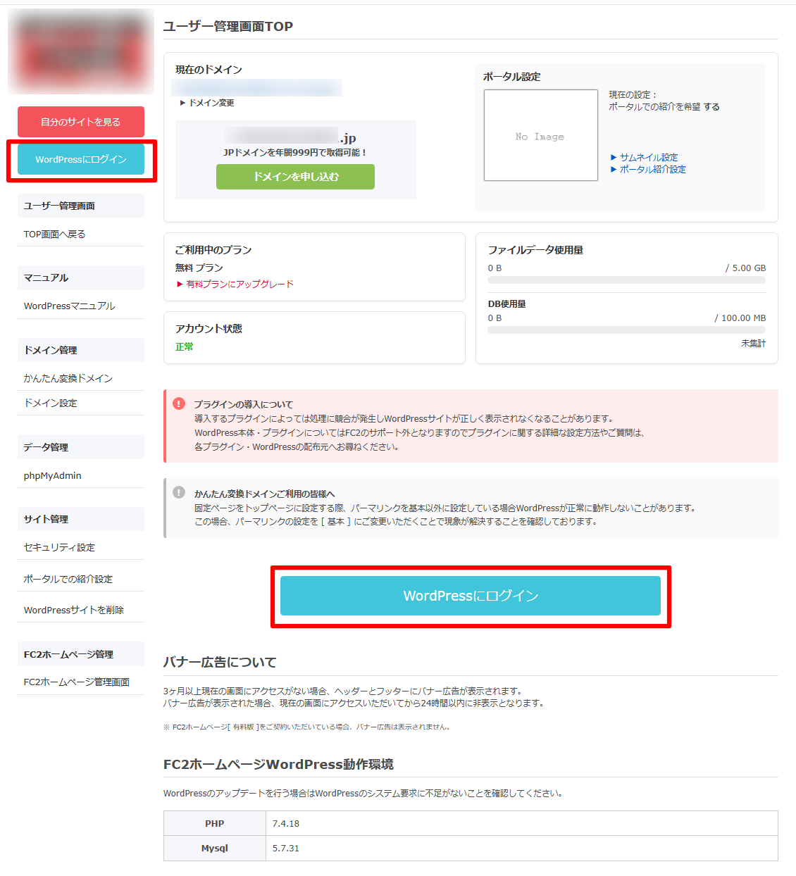 また、FC2ホームページより管理画面にログインいただき、WordPress管理画面に遷移後、「WordPressにログイン」ボタンよりアクセスが可能です。