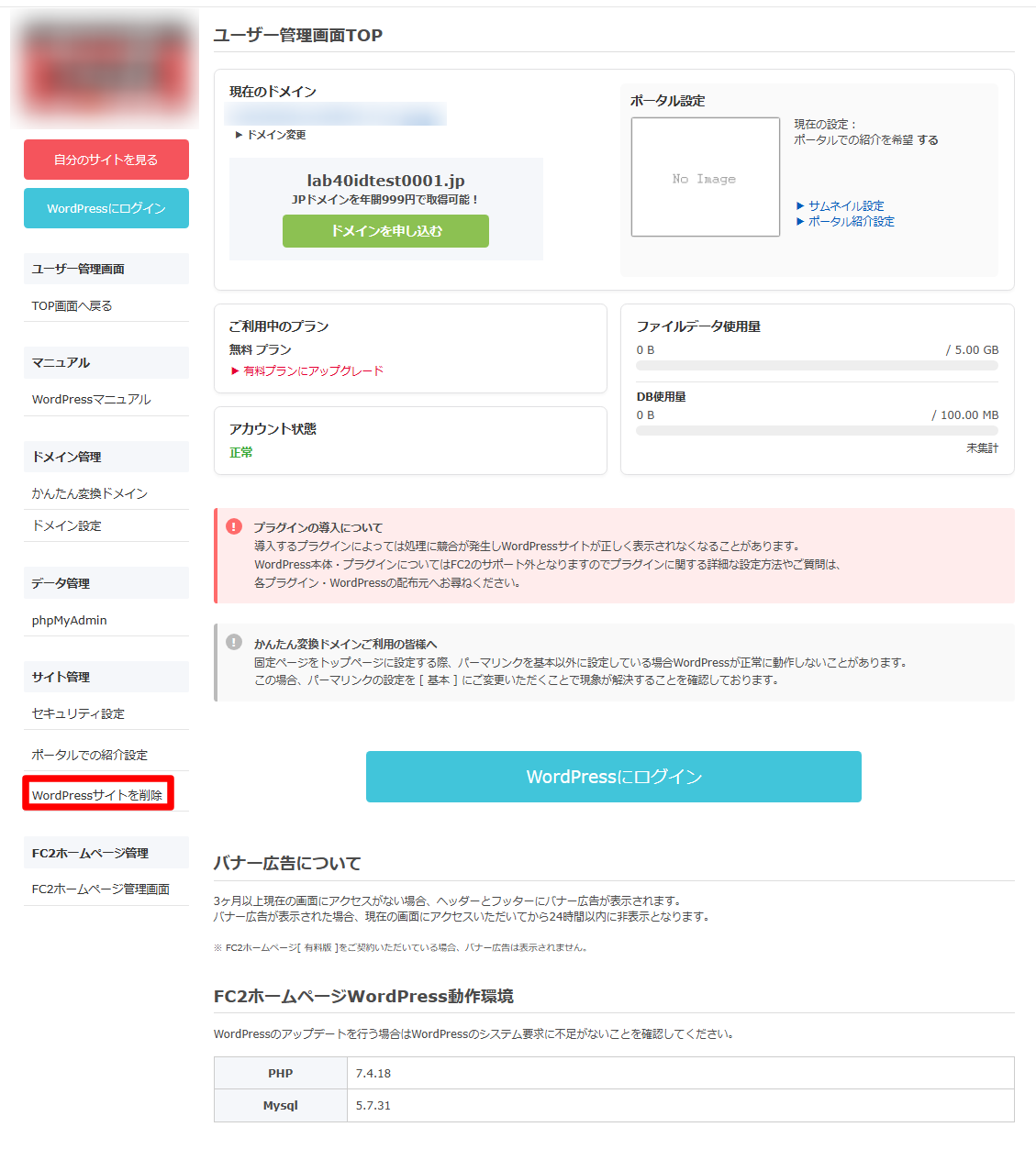 FC2ホームページのWordPressは下記手順で削除できます。