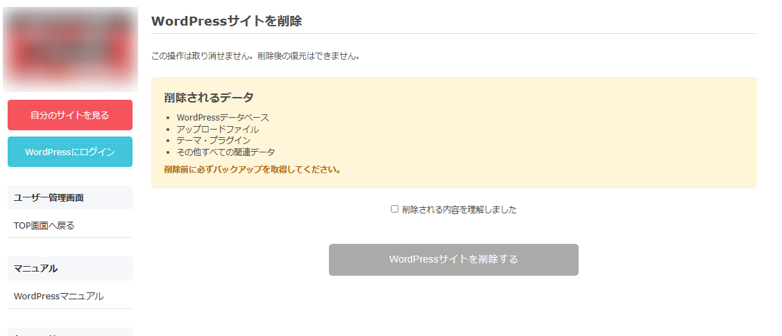 2. 記載内容を確認し、「削除される内容を理解しました。」にチェックを入れてから「WordPressサイトを削除する」をクリック。