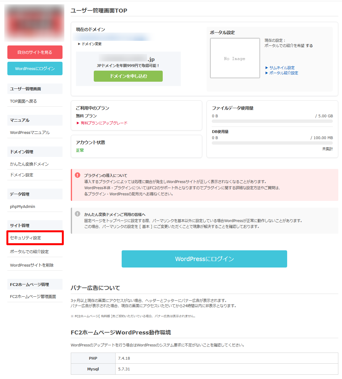 1. FC2ホームページWordpress管理ページの「セキュリティ設定」をクリック。